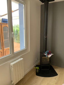 Travaux réalisés : isolation thermique par l'extérieur ; isolation de combles perdus ; isolation de plancher sur vide sanitaire ; ventilation et chauffe-eau thermodynamique sur air extrait ; poêle à bois bûches 3kW ; création de salle de bains et d'un espace sous toiture ; terrassement et assainissement individuel